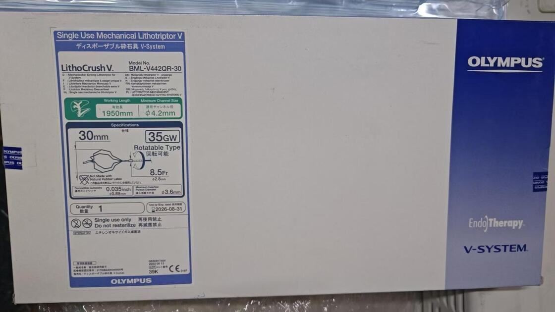 올림푸스 BML‐V442QR‐30 V- 시스템 일회용 기계 리토트립터 (Olympus BML‐V442QR‐30 V-System Single‐Use Mechanical Lithotriptor) 는 내시경 수술에서 특히 담낭에서 돌을 기계적으로 분쇄하기 위해 사용되는 의료 장치입니다.최소 침습 수술 중- 한 번 사용해서 다시 사용하지 않고 폐기하도록 설계되었습니다.